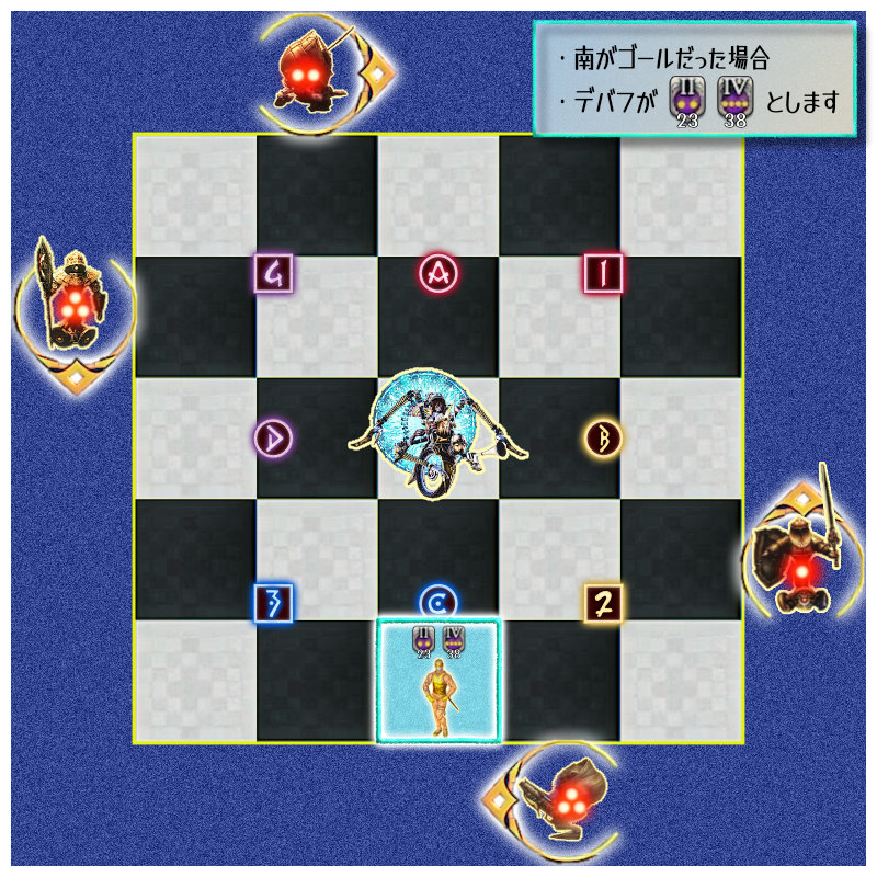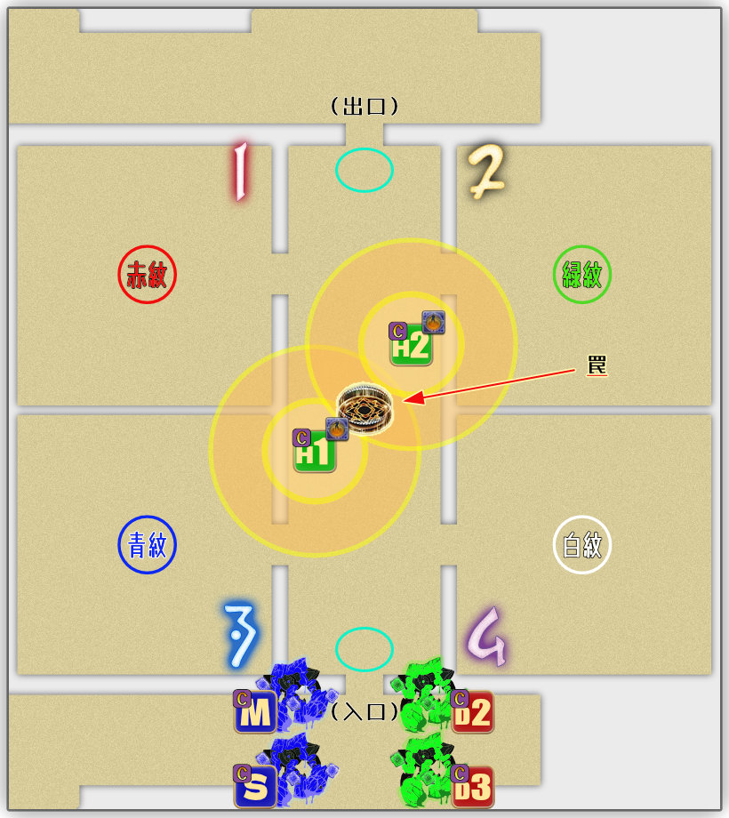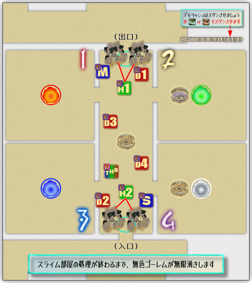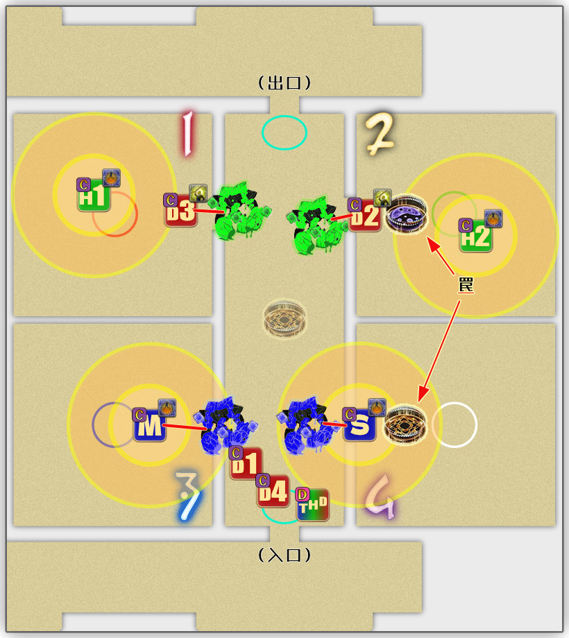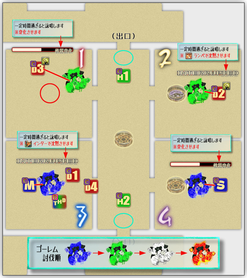 |処理順:青→緑→白→赤(担当以外はゴーレム削り) ※雑魚ゴーレム&罠(サイトラ):北=C/H1(罠/北西) 南=C/H2(罠/北東)