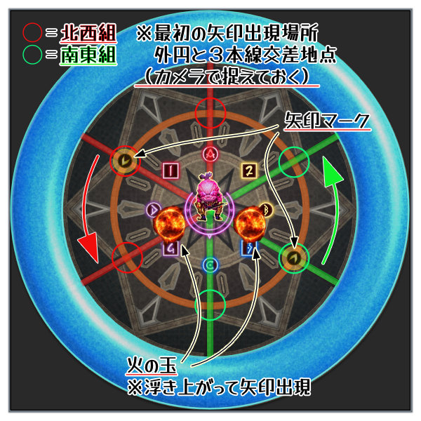 ・サテライト3回目(炎玉)は中央付近の炎玉が浮き上がったら、北西or南東の散会位置へ「最速」で行きましょう!