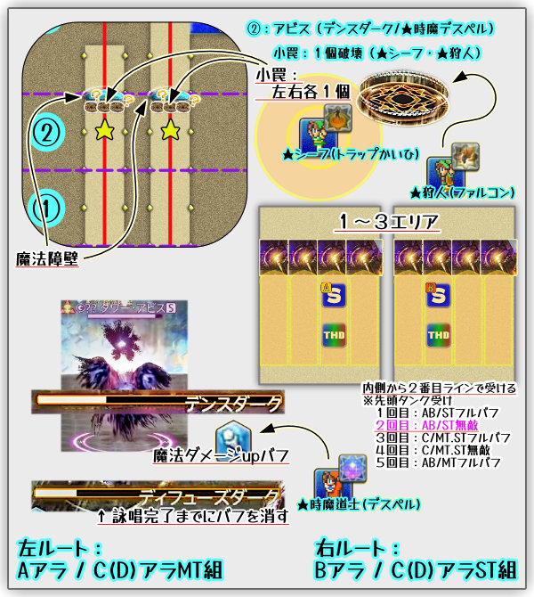 ┃② │「小罠1★狩人(ファルコン)」「アビス/デンスダーク★時魔(デスペル)」「直線AoE★AB/ST(無敵)」