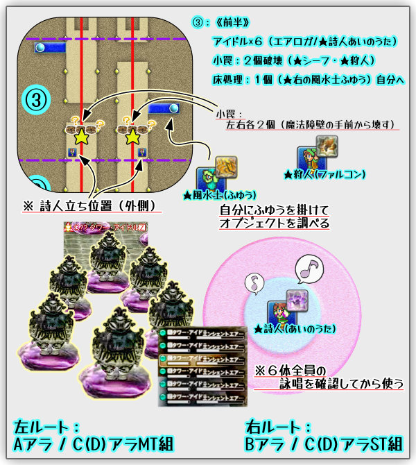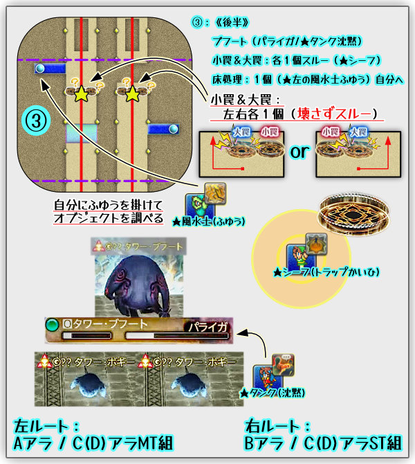 ┃③ (後)│「小罠&大罠各1★全員スルー」「ブフート/パライガ★タンク(沈黙)」「左オブジェ★左風水士(ふゆう)」